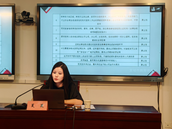 本次培訓特邀宣城市公共資源交易有限公司夏蓮擔任主講,全市各級各類學校、幼兒園及教體局相關(guān)直屬單位負責人、分管領(lǐng)導及具體經(jīng)辦人員參加。本次培訓重點突出、實操性強、覆蓋面廣。培訓內(nèi)容緊密圍繞當前學校招采工作的關(guān)鍵環(huán)節(jié)與突出風險點,進行系統(tǒng)梳理和精準剖析。